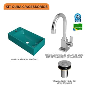 Sobre o ProdutoKit Cuba RL545 C/Torneira Luxo 1195 + Válvula Click 1''B (2,6cm) AmareloDescrição do ProdutoO Kit KTCARL545W.AM.LC70.V02 é uma combinação perfeita da Cuba de Apoio CARL545W.AM com acessórios complementares, prontos para instalação no seu lavabo ou móvel de banheiro. Ele conta com 1 Cuba de Apoio Retangular Roma 54,5X28,6cm Amarelo + 1 Torneira De Mesa Classic Luxo 1/4 De Volta 1195 C70 + 1 Válvula P/Lavatório Click Up Interno 1" (2,6cm) V02 Metal Cromado + 0+ 0+ 0 , todos compatíveis e prontos para instalação.Itens Inclusos:1 Cuba de Apoio + 1 Torneira de mesa baixa + 1 Válvula de Escoamento Clik Up Informações Logísticas:Vol.01 Comp.: 59,5cm Prof.: 34,5cm Alt.: 18cm Peso Bruto: 7,676Kg Observações:Não acompanha acessórios decorativos. Imagens meramente ilustrativas.Informações Técnicas / CaracterísticasCuba de Apoio Retangular Roma 54,5X28,6cm Amarelo Cor: Amarelo Marca: Compace Modelo: CARL545 Linha: Conect Formato: Retangular Tipo de Cuba: Apoio Material: Mármore Sintético Acabamento: Hard Lacca PU Escala de Brilho: Brilho Possui Ladrão: Não Possui Furação para Torneira: Sim Diâmetro do Furo para Torneira: (32mm) - DN 32 Diâmetro do Furo para Válvula: (40mm) - DN 40 Comprimento: 54,5cm Largura: 28,6cm Altura: 12,7cm Peso Líq.: 6,3Kg Recomendações de Uso, Manutenção e Limpeza: Utilize flanela seca ou pano macio, levemente umedecido com água. Evite contato com produtos químicos e abrasivos (solventes, thinner, acetona etc) e não utilize nenhum tipo de esponja de aço. Para maior brilho, recomendamos a utilização de cera automotiva n 2. Necessita de Montagem: Sim / Acompanha Manual de Montagem Complexidade da Montagem: Média: pode ser montado por mais de uma pessoa e/ou necessite de maior conhecimento para montagem. Garantia: 6 mesesTorneira De Mesa Classic Luxo 1/4 De Volta 1195 C70 Cor: Cromado Marca: Compace Modelo: CL1195 Linha: Classic Tipo de Torneira: Convencional Local: Lavatório Tipo de Instalação: De Mesa Acabamento: Camada de Cromo Salt Spray. Possui alta resistência contra corrosão, maresia, oxidação e descascamento. Material: Liga de Cobre (Bronze e Latão), Inox, Zamac, Elastômeros e Plásticos de Engenharia Possui Arejador Sim Tipo de Bica: Móvel Pressão Máxima: 40 m.c.a. Pressão Mínima: 2 m.c.a. Temperatura da Água Indicada: Mín.: 5 Celsius / Máx.: 70 Celsius Bitola do Cano: 1/2" Altura Total: 23cm Altura da base até a saída da água: 15cm Profundidade da saída da água até o final do cano: 14cm Peso Líq.: 0,48Kg Recomendações de Uso, Manutenção e Limpeza: Limpar apenas com pano macio e sabão neutro. Não usar produtos abrasivos como sapólio, palha de aço e produtos químicos. Garantia: 5 anosVálvula P/Lavatório Click Up Interno 1" (2,6cm) V02 Metal Cromado Cor: Cromado Marca: Compace Modelo: CO1612V02 Linha: Complementos Tipo: Click Local: Lavatório Acabamento: Cromado Material: Zamak, Elastômeros e Plásticos de Engenharia. Bitola do Cano: 1" Possui Ladrão: Não Altura: 7cm Diâmetro: 5,5cm Altura Total: 8cm Peso Líq.: 0,11Kg Recomendações de Uso, Manutenção e Limpeza: Limpar apenas com pano macio e sabão neutro. Não usar produtos abrasivos como sapólio, palha de aço e produtos químicos. Necessita de Montagem: Sim Complexidade da Montagem: Média: pode ser montado por mais de uma pessoa e/ou necessite de maior conhecimento para montagem. Garantia: 5 anos