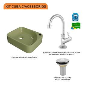 Sobre o ProdutoKit Cuba RO36 C/Torneira 1198 Metal + Válvula 1'' (2,6cm) AmareloDescrição do ProdutoO Kit KTCARO360W.AM.1198.V01 é uma combinação perfeita da Cuba de Apoio CARO360W.AM com acessórios complementares, prontos para instalação no seu lavabo ou móvel de banheiro. Ele conta com 1 Cuba de Apoio Retangular Cross 36,4cm Amarelo + 1 Torneira de Mesa p/Lavatório SL1198 1/4 Volta Metal Cromado + 1 Válvula P/Lavatório 1" (2,6cm) V01 Metal Cromado + 0+ 0+ 0 , todos compatíveis e prontos para instalação.Itens Inclusos:1 Cuba de Apoio + 1 Torneira de mesa baixa + 1 Válvula de Escoamento Informações Logísticas:Vol.01 Comp.: 37,5cm Prof.: 37,5cm Alt.: 17cm Peso Bruto: 4,688Kg Observações:Não acompanha acessórios decorativos. Imagens meramente ilustrativas.Informações Técnicas / CaracterísticasCuba de Apoio Retangular Cross 36,4cm Amarelo Cor: Amarelo Marca: Compace Modelo: CARO360 Linha: Conect Formato: Retangular Tipo de Cuba: Apoio Material: Mármore Sintético Acabamento: Hard Lacca PU Escala de Brilho: Brilho Possui Ladrão: Não Possui Furação para Torneira: Sim Diâmetro do Furo para Torneira: (32mm) - DN 32 Diâmetro do Furo para Válvula: (40mm) - DN 40 Comprimento: 36,4cm Largura: 29,5cm Altura: 9,7cm Peso Líq.: 3,4Kg Recomendações de Uso, Manutenção e Limpeza: Utilize flanela seca ou pano macio, levemente umedecido com água. Evite contato com produtos químicos e abrasivos (solventes, thinner, acetona etc) e não utilize nenhum tipo de esponja de aço. Para maior brilho, recomendamos a utilização de cera automotiva n 2. Necessita de Montagem: Sim / Acompanha Manual de Montagem Complexidade da Montagem: Média: pode ser montado por mais de uma pessoa e/ou necessite de maior conhecimento para montagem. Garantia: 6 mesesTorneira de Mesa p/Lavatório SL1198 1/4 Volta Metal Cromado Cor: Cromado Marca: Compace Modelo: SL1198 Linha: Slim Tipo de Torneira: Convencional Local: Lavatório Tipo de Instalação: De Mesa Acabamento: Camada de Cromo Salt Spray. Possui alta resistência contra corrosão, maresia, oxidação e descascamento. Material: Liga de Cobre (Bronze e Latão), Inox, Zamac, Elastômeros e Plásticos de Engenharia Possui Arejador Sim Tipo de Bica: Móvel Pressão Máxima: 40 m.c.a. Pressão Mínima: 2 m.c.a. Temperatura da Água Indicada: Mín.: 5 Celsius / Máx.: 70 Celsius Bitola do Cano: 1/2" Altura Total: 19cm Altura da base até a saída da água: 13cm Profundidade da saída da água até o final do cano: 11,5cm Peso Líq.: 0,26Kg Recomendações de Uso, Manutenção e Limpeza: Limpar apenas com pano macio e sabão neutro. Não usar produtos abrasivos como sapólio, palha de aço e produtos químicos. Garantia: 5 anosVálvula P/Lavatório 1" (2,6cm) V01 Metal Cromado Cor: Cromado Marca: Compace Modelo: CO1603V01 Linha: Complementos Tipo: Convencional Local: Lavatório Acabamento: Cromado Material: Zamak, Elastômeros e Plásticos de Engenharia. Bitola do Cano: 1" Possui Ladrão: Não Altura: 7cm Diâmetro: 5,5cm Altura Total: 7,5cm Peso Líq.: 0,09Kg Recomendações de Uso, Manutenção e Limpeza: Limpar apenas com pano macio e sabão neutro. Não usar produtos abrasivos como sapólio, palha de aço e produtos químicos. Necessita de Montagem: Sim Complexidade da Montagem: Média: pode ser montado por mais de uma pessoa e/ou necessite de maior conhecimento para montagem. Garantia: 5 anos