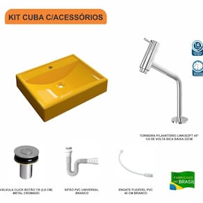 O Kit KTCART490W.CL.1060.AP02 é uma combinação perfeita da Cuba de Apoio CART490W.CL com acessórios complementares, prontos para instalação no seu lavabo ou móvel de banheiro. Ele conta com 1 Cuba de Apoio Retangular RT49 50,5X40cm Colorida e 1 Torneira para Lavatório Pratika 45° 1/4 Volta Bica Baixa 22cm Metal Cromado e 1 Válvula para Lavatório Click Up Interno 1 Polegada (2,6cm) V02 Metal Cromado e 1 Sifão Pvc Universal Branco e 1 Engate Flexível Pvc Branco 40cm, todos compatíveis e prontos para instalação. Acompanha Flexível: Sim Acompanha Manual de Instalação: Sim Acompanha Sifão: Sim Acompanha Torneira: Sim Altura: 10,5 cm Altura da Torneira: 22 cm Ambiente Principal: Banheiro Comprimento: 50,5 cm Comprimento do Flexível: 40 cm Comprimento Máximo do Sifão: 71 cm Comprimento Mínimo do Sifão: 29 cm Cor: Amarelo Cor do Produto: Amarelo Diâmetro: cm Diâmetro de Entrada do Sifão: 1.1/4 Polegadas Diâmetro de Saída do Sifão: 1.1/4 Polegadas Diâmetro do Flexível: 1/2 Polegada Diâmetro do furo: 32 mm Diâmetro para válvula: 32 mm Espessura: mm Itens Inclusos: 1 Cuba de Apoio, 1 Torneira de mesa baixa, 1 Válvula de Escoamento Clik Up, 1 Sifão PVC Universal Branco, 1 Engate Flexível 40cm Largura: 40 cm Linha ou Coleção: Plus Manual de Montagem e Instalação: https://cdn2.madeiramadeira.com.br/atributo/compace/663381-ktcart490wcl1060ap02.rar Material da Torneira: Latão Material do Flexível: PVC Material do Sifão: PVC Material Principal: Mármore Sintético Origem do Produto: Nacional Peso: 7,02 kg Possui furação para torneira: Sim Possui ladrão: Não Pressão Indicada do Flexível: Baixa Pressão Pressão Máxima da Torneira: 40 mca Pressão Mínima da Torneira: 2 mca Profundidade: cm Recomendações de Uso, Manutenção e Limpeza: Utilize flanela seca ou pano macio, levemente umedecido com água. Evite contato com produtos químicos e abrasivos (solventes, thinner, acetona etc) e não utilize nenhum tipo de esponja de aço. Para maior brilho, recomendamos a utilização de cera automotiva n° 2. Tipo de Acionamento da Torneira: 1/4 de volta Tipo de sifão: Flexível Válvula oculta: Não