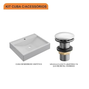 Sobre o ProdutoKit Cuba RT49 C/Válvula Click 1''G BrancaDescrição do ProdutoO Kit KTCART490W.BR.V03 é uma combinação perfeita da Cuba de Apoio CART490W.BR com acessórios complementares, prontos para instalação no seu lavabo ou móvel de banheiro. Ele conta com 1 Cuba de Apoio Retangular RT49 50,5X40cm Branca + 1 Válvula P/Lavatório Click Up 1 (2,6cm) V03 Metal Cromado + 0+ 0+ 0+ 0 , todos compatíveis e prontos para instalação.Itens Inclusos:1 Cuba de Apoio + 1 Válvula de Escoamento Clik Up Informações Logísticas:Vol.01 - Comp.: 61cm - Prof.: 43cm - Alt.: 17cm - Peso Bruto: 7,42Kg Observações:Não acompanha acessórios decorativos. Imagens meramente ilustrativas.Informações Técnicas / CaracterísticasCuba de Apoio Retangular RT49 50,5X40cm Branca- Cor: Branca- Marca: Compace- Modelo: CART490- Linha: Plus- Formato: Retangular- Tipo de Cuba: Apoio- Material: Mármore Sintético- Acabamento: Hard Lacca PU- Escala de Brilho: Brilho- Possui Ladrão: Não- Possui Furação para Torneira: Sim- Diâmetro do Furo para Torneira: (32mm) - DN 32- Diâmetro do Furo para Válvula: (32mm) - DN 32 - Comprimento: 50,5cm- Largura: 40cm- Altura: 10,5cm - Peso Líq.: 6,4Kg- Recomendações de Uso, Manutenção e Limpeza: Utilize flanela seca ou pano macio, levemente umedecido com água. Evite contato com produtos químicos e abrasivos (solventes, thinner, acetona etc) e não utilize nenhum tipo de esponja de aço. Para maior brilho, recomendamos a utilização de cera automotiva n 2.- Necessita de Montagem: Sim / Acompanha Manual de Montagem- Complexidade da Montagem: Média: pode ser montado por mais de uma pessoa e/ou necessite de maior conhecimento para montagem.- Garantia: 6 mesesVálvula P/Lavatório Click Up 1 (2,6cm) V03 Metal Cromado- Cor: Cromado- Marca: Compace- Modelo: CO1613V03- Linha: Complementos- Tipo: Click- Local: Lavatório- Acabamento: Cromado- Material: Zamak, Elastômeros e Plásticos de Engenharia.- Bitola do Cano: 1- Possui Ladrão: Não - Altura: 8cm- Diâmetro: 5,7cm - Altura Total: 9cm- Peso Líq.: 0,18Kg- Recomendações de Uso, Manutenção e Limpeza: Limpar apenas com pano macio e sabão neutro. Não usar produtos abrasivos como sapólio, palha de aço e produtos químicos.- Necessita de Montagem: Sim- Complexidade da Montagem: Média: pode ser montado por mais de uma pessoa e/ou necessite de maior conhecimento para montagem.- Garantia: 5 anos Formato: Retangular | Tipo de Cuba: Apoio | Material: Mármore Sintético | Acabamento: Hard Lacca PU Fosco | Escala de Brilho: Fosco | Possui Furação para Torneira: Sim | Diâmetro do Furo para Torneira: (32mm) - DN 32 | Diâmetro do Furo para Válvula: (32mm) - DN 32 | Itens Inclusos: 1 Cuba de Apoio + 1 Válvula de Escoamento Clik Up | Limite de unidades por venda: É possível comprar até 1 unidade por venda. | Quantidade máxima de pedido: 1 | Baterias são necessárias?: false Cor: Branco