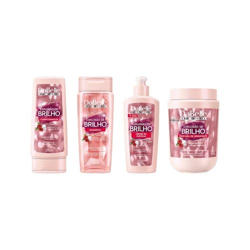 Esse kit contém: 1 Shampoo Dabelle 250ml Explosao de Brilho, 1 Condicionador Dabelle Explosao de Brilho 200ml, 1 Creme Para Pentear Dabelle Explosao de Brilho 270g e Mascara Dabelle 800g Explosao de Brilho.