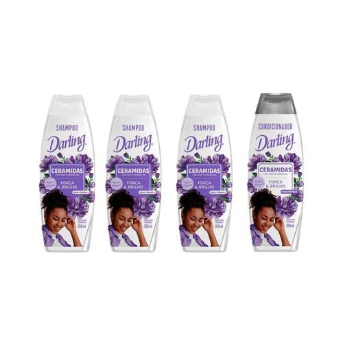 Kit darling ceramidas 3 shampoos 350ml+ 1 condicionador 350ml Descrição: O kit darling ceramidas contém 3 shampoos e 1 condicionador, ideal para cabelos que necessitam de hidratação profunda e reparação. Com fórmula rica em ceramidas, esses produtos ajudam a restaurar a saúde dos fios, proporcionando brilho e maciez. O uso contínuo garante cabelos mais fortes, resistentes e fáceis de pentear. Modo de uso: Shampoo 3 unidades : aplique o shampoo nos cabelos molhados, massageando suavemente o couro cabeludo até formar espuma. Enxágue bem e, se necessário, repita a aplicação. Condicionador 1 unidade : após lavar com o shampoo, aplique o condicionador no comprimento e nas pontas dos cabelos úmidos. Massageie suavemente e deixe agir por alguns minutos. Enxágue completamente. Marca: Não Informado