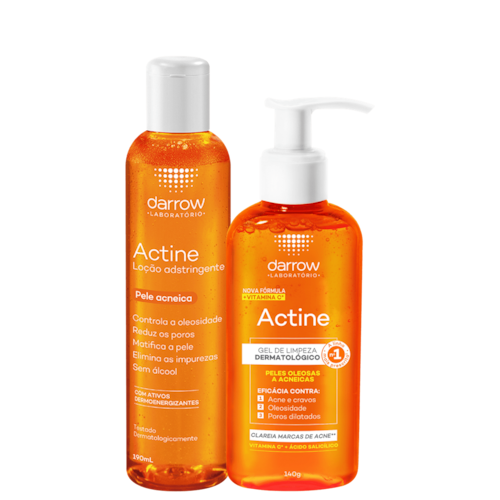 Kit Darrow Actine Skincare com gel de limpeza e adstringente para remoção da oleosidade. Indicado para peles oleosas e acneicas.