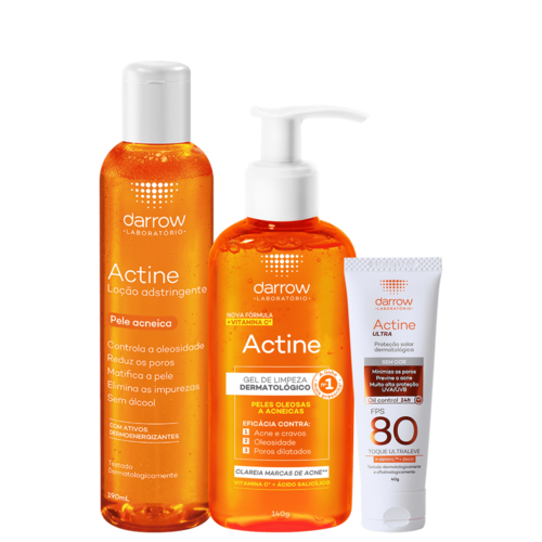 Kit com gel de limpeza, adstringente e protetor solar para peles oleosas. Kit Darrow Actine Ultra pele protegida e com aspecto sequinho o dia todo.