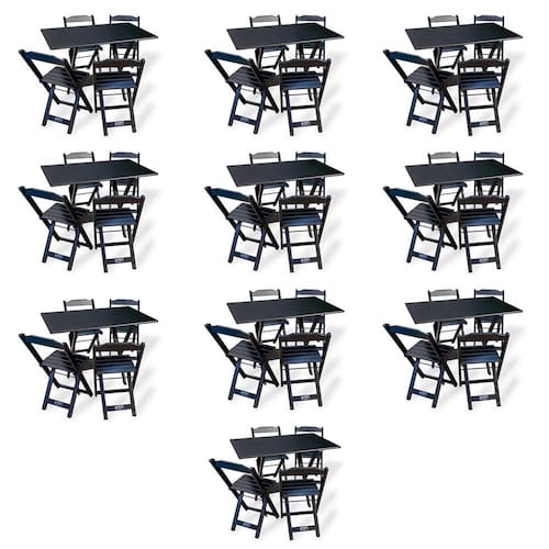 Kit De 10 Conjuntos De Mesa Dobrável 70x110 Com 4 Cadeiras Preto - Tarimatã é ideal para bares, restaurantes, estabelecimentos, áreas de lazer e tambem para sua casa. Em madeira maciça, tornando-os resistentes e duráveis. Seu design permite que esse conjunto seja encaixado em qualquer ambiente, trazendo um toque a mais para seu estabelecimento. Além de sua durabilidade, o que lhe trará conforto para servir seus clientes. Por ser dobrável torna-se mais fácil guardar, manusear e limpar o produto. Atenção: EVITE USAR PRODUTOS ABRASIVOS E QUÍMICOS PARA LIMPEZA DO PRODUTO, aconselha-se o uso de pano umedecido para melhor conservação mantenha o produto fora de chuva e sol constantes. *imagens meramente ilustrativas* Dimensões Mesa:Tampo 67,5 x 108,5 cmAltura 77cm Dimensões Cadedeira:Altura da cadeira aberta 78cmAltura da cadeira fechada 89cmAltura até o assento 46cmLargura 41,5cmLargura vão do assento 37,5cmProfundidade 40cmProfundidade do assento 32cm Marca: TARIMATA
