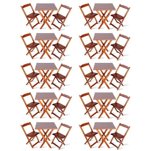 Kit De 10 Conjuntos De Mesa Dobrável 70x70 Com 2 Cadeiras Imbuia - Tarimatãé ideal para bares, restaurantes, estabelecimentos, áreas de lazer e tambem para sua casa. Em madeira maciça, tornando-os resistentes e duráveis. Seu design permite que esse conjunto seja encaixado em qualquer ambiente, trazendo um toque a mais para seu estabelecimento. Além de sua durabilidade, o que lhe trará conforto para servir seus clientes. Por ser dobrável torna-se mais fácil guardar, manusear e limpar o produto.Atenção: EVITE USAR PRODUTOS ABRASIVOS E QUÍMICOS PARA LIMPEZA DO PRODUTO, aconselha-se o uso de pano umedecido para melhor conservação mantenha o produto fora de chuva e sol constantes.*imagens meramente ilustrativas*Dimensões Mesa:Tampo 67,3 x 67,3 cmAltura 77cmDimensões Cadedeira:Altura da cadeira aberta 78cmAltura da cadeira fechada 89cmAltura até o assento 46cmLargura 41,5cmLargura vão do assento 37,5cmProfundidade 40cmProfundidade do assento 32cmKit de 10 Conjuntos de Mesa DobrÃvel 70x70 com 2 Cadeiras Imbuia - TarimatÃ
