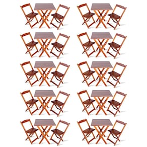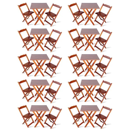 Kit De 10 Conjuntos De Mesa Dobrável 70x70 Com 2 Cadeiras Imbuia - Tarimatã é ideal para bares, restaurantes, estabelecimentos, áreas de lazer e tambem para sua casa. Em madeira maciça, tornando-os resistentes e duráveis. Seu design permite que esse conjunto seja encaixado em qualquer ambiente, trazendo um toque a mais para seu estabelecimento. Além de sua durabilidade, o que lhe trará conforto para servir seus clientes. Por ser dobrável torna-se mais fácil guardar, manusear e limpar o produto. Atenção: EVITE USAR PRODUTOS ABRASIVOS E QUÍMICOS PARA LIMPEZA DO PRODUTO, aconselha-se o uso de pano umedecido para melhor conservação mantenha o produto fora de chuva e sol constantes. *imagens meramente ilustrativas* Dimensões Mesa:Tampo 67,3 x 67,3 cmAltura 77cm Dimensões Cadedeira:Altura da cadeira aberta 78cmAltura da cadeira fechada 89cmAltura até o assento 46cmLargura 41,5cmLargura vão do assento 37,5cmProfundidade 40cmProfundidade do assento 32cm Marca: TARIMATA