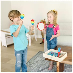 O conjunto de instrumentos musicais BandinaBox é perfeito para crianças em idade pré escolar que desejam formar uma banda infantil, explorar músicas e sons ou lançar uma carreira solo. Ele inclui uma variedade de instrumentos, como pandeiro, pratos, maracas, clacker, blocos de tom e um triângulo, além de uma caixa de armazenamento de madeira resistente. Os instrumentos musicais de Melissa Doug ajudam as crianças a desenvolver um ouvido musical e este conjunto expõe seu minimúsico a diferentes tons, volumes e ritmos. Para manter este conjunto de banda para crianças organizado, incluímos uma caixa de madeira durável que tem bastante espaço para armazenar cada um dos 10 instrumentos. Este conjunto é um presente ideal para crianças de 3 a 6 anos. A Melissa Doug tem mais de 30 anos de experiência em criar produtos lindamente projetados que estimulam a imaginação e a criatividade, sendo considerada pela NBC News o padrão ouro nas brincadeiras da primeira infância.