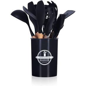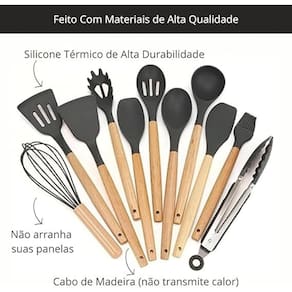 Conjunto Completo: Este conjunto contém 12 utensílios de cozinha essenciais, incluindo espátulas, conchas, batedor de ovos e muito mais. Materiais Duráveis: Os cabos são feitos de madeira resistente e as partes de silicone são à prova de calor e antiaderentes. Design Ergonômico: Os cabos de madeira oferecem um ótimo conforto e aderência durante o uso. Fácil Limpeza: As peças de silicone podem ser lavadas na máquina de lavar louça para uma limpeza conveniente. Armazenamento Compacto: O conjunto vem com um suporte cilíndrico para organizar os utensílios na cozinha.