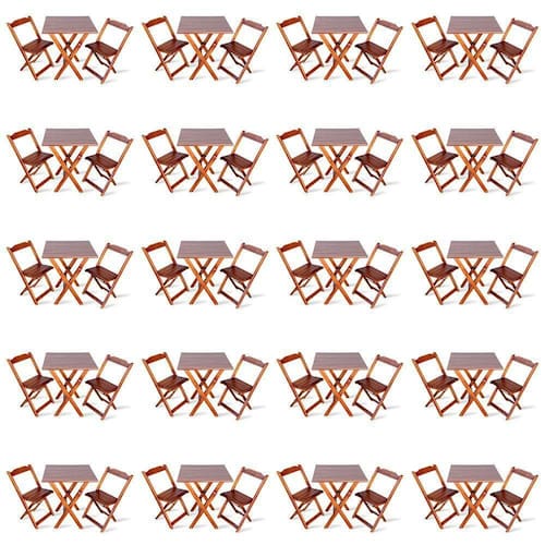 Kit De 20 Conjuntos De Mesa Dobrável 70x70 Com 2 Cadeiras Imbuia - Tarimatãé ideal para bares, restaurantes, estabelecimentos, áreas de lazer e tambem para sua casa. Em madeira maciça, tornando-os resistentes e duráveis. Seu design permite que esse conjunto seja encaixado em qualquer ambiente, trazendo um toque a mais para seu estabelecimento. Além de sua durabilidade, o que lhe trará conforto para servir seus clientes. Por ser dobrável torna-se mais fácil guardar, manusear e limpar o produto.Atenção: EVITE USAR PRODUTOS ABRASIVOS E QUÍMICOS PARA LIMPEZA DO PRODUTO, aconselha-se o uso de pano umedecido para melhor conservação mantenha o produto fora de chuva e sol constantes.*imagens meramente ilustrativas*Dimensões Mesa:Tampo 67,3 x 67,3 cmAltura 77cmDimensões Cadedeira:Altura da cadeira aberta 78cmAltura da cadeira fechada 89cmAltura até o assento 46cmLargura 41,5cmLargura vão do assento 37,5cmProfundidade 40cmProfundidade do assento 32cmKit de 20 Conjuntos de Mesa DobrÃvel 70x70 com 2 Cadeiras Imbuia - TarimatÃ