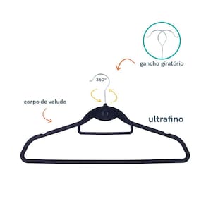 Com ele, aquelas roupas que teimam em escorregar, não vão ter mais chance - ele é de veludo, meu bem. E se é mais espaço que você quer, esse cabide é a solução: além de ser ultrafino, ele tem um gancho frontal que permite pendurar um cabide no outro - maravilhoso! Com ele, colocar a roupa no cabide para o lado errado não é um problema: seu gancho é giratório!