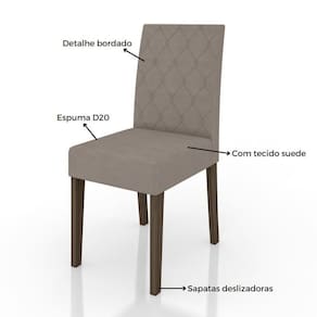 Marca: DoceLar | Modelo: Cadeira Jade com Tecido Suede Bordado | Altura: 96 cm | Largura: 41 cm | Profundidade: 62 cm | Altura Embalagem: 9 | Largura Embalagem: 41 | Profundidade Embalagem: 97 | Peso: 44,4 kg | Peso Embalagem: 44,4 | Material: MDF de 25 mm, MDF de 60 mm, espuma D20 revestido de suede bordado | Tonalidade: Multicolorido | Cômodo Indicado: Salas | Descrição do tamanho: 96 x 41 x 62 cm | Estado de origem: SP | Garantia em meses: 03 meses de garantia para de fabricação | Precisa de montagem?: Sim | É empilhável: Não | Profundidade do assento: 45 cm | É dobrável: Não | Condição do item: | Profundidade da cadeira: 62 cm | Fonte do produto: DoceLar | Peso máximo suportado: 120 kg | Material dos pés: MDF com sapatas | Quantidade de cadeiras por conjunto: 6 | Material do assento: espuma D20 revestido de suede bordado | Incluí estofamento: Sim | Espessura do assento: D20 | Materiais da estrutura: MDF de 25 mm, MDF de 60 mm | É cadeira de balanço: Não | É cadeira para exterior: Não | Largura do assento: 41 cm | Desenho do tecido: Bordado | Material do estofamento: espuma D20 com revestimento suede bordado | Com assento almofado: Sim | Altura da cadeira: 96 cm | Enchimento do estofamento: espuma D20 | Desenho da cadeira: bordado | Altura do assento a partir do solo: 51 cm | Fabricante: DoceLar | Largura da cadeira: 41 cm | É kit: Sim | Estilo: Moderno | Firmeza: D20 | Código de homologação ANATEL: Não se aplica | Precisa de baterias ou pilhas (areBatteriesRequired): Não | Regulamentações aplicáveis a produtos perigosos (supplierDeclaredDGHZRegulation): Não se aplica Cor: Amendoa/Capuccino