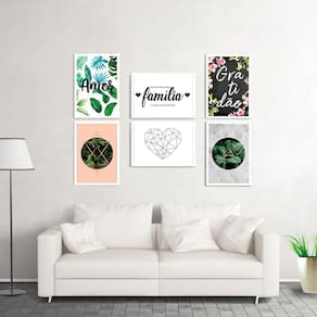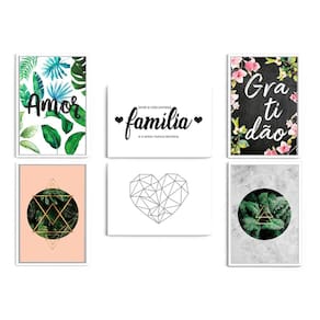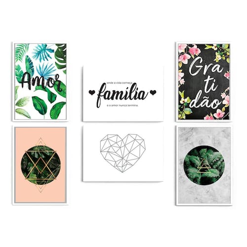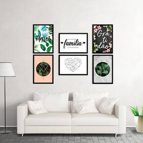 Kit De 6 Quadros Amor, Familia E Gratidão A4 Quadros com moldura em madeira. Fita dupla face para pendurar sem sujeira. Este produto é a opção ideal para quem deseja comodidade na hora de decorar. Informações do produto Moldura com 2cm de largura em madeira pinus com excelente acabamento fosco e arte impressa em vinil fosco alta durabilidade. Acompanha fita dupla face já instalada para pendurar a moldura e embalagem protetora com cantoneiras que evitam danos durante o transporte. Formato: 6 quadros tamanho A4: gravuras no tamanho 21x30cm - medida externa: 24x33cm. Medida externa total da aplicação 81x66cm. Prazo de produção: 03 a 05 dias úteis após aprovação do pagamento. As cores podem ter pequenas variações em relação a imagem do seu monitor. As medidas podem sofrer mínimas variações. Marca: Sdesign Ean: 7898694731002