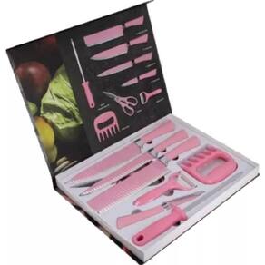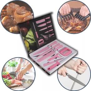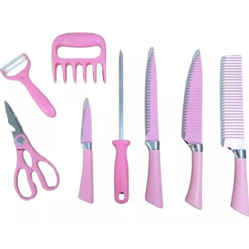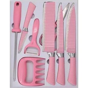 Kit de 8 Peças Churrasco Profissional Antiaderente Cor Rosa - Kit Jogo de Facas 8 Peças Cozinha Churrasco - Rosa
