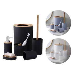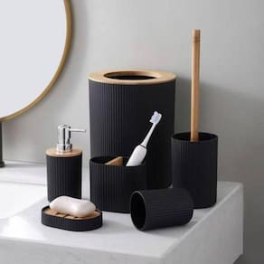 Kit de Acessórios para Banheiro 06 Peças em Bambu + ABS Kit de Acessórios para Banheiro 06 Peças em Bambu + ABS ===================================== Perfeito para manter a higiene e a praticidade do ambiente, este conjunto combina itens essenciais com um design moderno e harmonioso, ideal para qualquer estilo de decoração. Desfrute da comodidade de uma solução completa para seus cuidados diários, proporcionando organização impecável e eficiência inigualável. Com um design moderno que combina plástico durável e madeira refinada, este conjunto não só aprimora sua rotina de higiene, mas também eleva o visual do seu banheiro. Não perca a oportunidade de investir em um produto que oferece funcionalidade excepcional e estilo incomparável. ===================================== Contém: 01 Porta Escova de Dentes 01 Lixeira com Tampa Vazada 01 Porta Sabonete Líquido 01 Saboneteira 01 Copo Multiuso 01 Escova Sanitária com Suporte Especificações: - Material: Plástico e Bambu - Medida Porta Escova de Dentes: 9,5 cm x 7,5 cm x 12 cm - Medida Lixeira com Tampa Vazada: 24,5cm x 19,5 - Medida Porta Sabonete Líquido: 16cmx 07cm - Medida Saboneteira: 03 cm x 8,5 cm x 12,5 - Medida Copo Multiuso: 10cm x 7,5cm - Medida Suporte Escova Sanitária: 14cm x 09cm - Medida Escova Sanitária: 34cm de comprimento - Capacidade Porta Sabonete Líquido: 300ml - Cor enviada de forma aleatória conforme disponibilidade em ===================================== Devido à diferença entre monitores e iluminação diferentes, pode haver variação na tonalidade apresentada no anúncio. Medidas muito aproximadas. Ean: 6013400030816