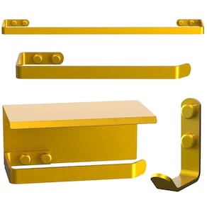 Um banheiro organizado proporciona leveza e praticidade para sua rotina. Para manter o ambiente sempre funcional e sofisticado, o Kit de Acessórios para Banheiro MAX Dourado é a escolha ideal, composto por 4 peças que harmonizam perfeitamente o espaço.MEDIDASPorta Papel Higiênico: Altura 6,5 cm x Profundidade 9 cm x Largura 15 cmGancho: Altura 6,5 cm x Profundidade 5,5 cm x Largura 1,6 cmPorta Toalha de Banho: Altura 1,6 cm x Profundidade 6 cm x Largura 44 cmPorta Toalha de Rosto: Altura 1,6 cm x Profundidade 6 cm x Largura 21 cmO kit possui design clean e elegante. As peças são produzidas com materiais nobres: porta shampoo e porta sabonete em aço inox, e as demais em barra chata de alumínio maciço. O acabamento em pintura eletrostática epóxi dourada oferece alta durabilidade, resistência e proteção contra ferrugem.BENEFÍCIOS- Acabamento Premium na cor dourada- Resistente à água e à corrosão- Não enferruja- Tampa de acabamento que oculta os parafusos- Furos alinhados com parafusos sextavados para instalação prática e precisaESPECIFICAÇÕES TÉCNICAS- Cor: Dourado - Acabamento: Pintura Eletrostática Epóxi Dourada- Material das demais peças: Barra chata de alumínio maciço- Espessura da barra chata: 4 mm- Largura da barra chata: 16 mm- Quantidade de peças no kit: 04ITENS INCLUSOS- 01 unidade – Porta Papel Higiênico MAX Dourado- 01 unidade – Gancho MAX Dourado- 01 unidade – Porta Toalhas de Banho MAX Dourado- 01 unidade – Porta Toalhas de Rosto MAX DouradoTodos os itens acompanham parafusos, buchas e tampas exclusivas para acabamento dos parafusos. Marca: Não Informado