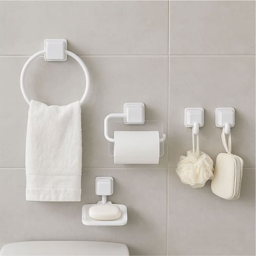 O Kit de Acessórios para Banheiro 5 Peças – Branco entrega praticidade e um toque de design na sua bancada e paredes. A paleta Branca cria um visual atual e elegante, enquanto as peças essenciais mantêm toalhas, papel, sabonete e itens do dia a dia sempre à mão.