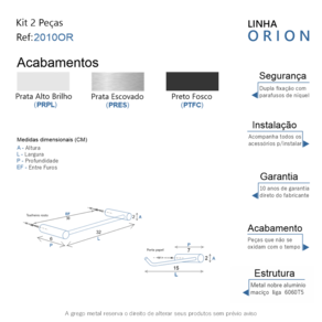 • Fabricado em metal alumínio. • Disponível no Prata Alto Brilho, Escovado e Preto Fosco. • Pode ser instalado em parede, azulejo e porcelanato.