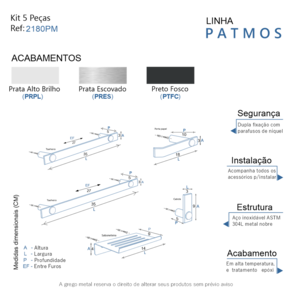 ITENS ENVIADOS: 1 cabide, 1 porta papel higiênico, 1 saboneteira, 1 toalheiro 35cm, 1 toalheiro 55cm, kit de parafusos e manual instrução instalação.