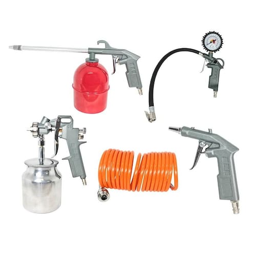 Aplicação em compressores de ar. Ideal para funilaria, serralheria, borracharia e oficina mecânica. Utilizado tanto na pintura, como limpeza, pulverização e para encher pneus. Dados técnicos marca: noll contém 5 peças, sendo: 1 ferramenta de aplicação pulverizadora 1 ferramenta de aplicação de pintura 1 ferramenta de aplicação de ar 1 calibrador de pneus ferramenta de aplicação 1 mangueira espiral 5m