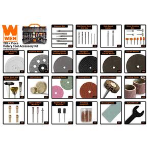 Kit de acessórios para ferramentas rotativas WEN 230282A de 282 peças com estojo de transporte - Possui 282 acessórios para lixar, esculpir, rebarbar, cortar, perfurar, lixar, polir, gravar e muitos outros verbos - Pincéis com cerdas de arame funcionam muito bem para remover ferrugem, decapar tinta, esculpir abóbora e muito mais - Discos e brocas de moagem perfeitos para afiar facas ou aparar facas unhas para cães — Inclui brocas de metal revestidas com diamante, cortadores HSS, discos de lixar, discos de corte, faixas de lixar de fuso, rodas de polir, brocas, pasta de polimento e muito mais - Compatível com as ferramentas rotativas WEN, bem como com qualquer outra ferramenta rotativa que aceite brocas com hastes de 1/8 de polegada