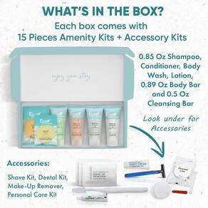 - ESTOJO ABRANGENTE DE 15 CAIXAS: eleve a experiência de seus hóspedes com nossas caixas de hóspedes, que incluem 1 de cada uma das seguintes opções: xampu, condicionador, loção corporal, sabonete líquido e barra corporal. Além disso, barra de limpeza, kit de barbear, kit odontológico, removedor de maquiagem e kit de penteadeira.