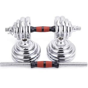 - Ajustável para a sua necessidade (até 30kg); - Equipamento de Ótima Qualidade; - Material das Barras: São feitas em ferro fundido maciço, com pintura cromada de qualidade superior. Os pegadores, a parte externa é de plástico reforçado, e as barras são feitas em ferro fundido maciço, com pintura cromada. E a barra central, a parte externa possui um acabamento espumado em eva. - Material das Anilhas: São feitos de ferro fundido maciço com pintura cromada (pintura com qualidade superior às tintas pretas normalmente utilizadas)