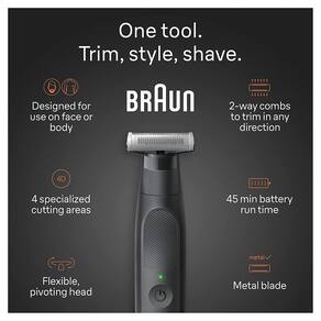 Série XT5 da Braun — aparador de barba, barbeador e barbeador elétrico para homens, kit de higiene corporal para paisagismo, uma lâmina durável, uma ferramenta para barba, cabelo, virilha, axilas, XT5100 — Corte, borde e estilize com uma ferramenta: barbeador elétrico tudo-em-um e aparador de barba para homens. Adicione a Série X da Braun ao seu regime de higiene para uma higiene fácil, rápida e confortável em cada movimento. Para rosto (pentes de 1, 2, 3, 5 mm) e corpo (pentes de 0, 3 mm). Desfrute de um barbear confortável e não muito próximo. - Tecnologia 4D-Blade: uma lâmina com 4 elementos de corte, consistindo em 2 aparadores laterais e 2 zonas centrais de corte, fazendo 450 movimentos por segundo. Barbeia-se perto o suficiente para ter uma ótima aparência, mantendo a suavidade da pele - Construído para durar mais: este aparador e barbeador de aço inoxidável 4D Blade permanece afiado por até 6 meses* *Com base em dois barbeadores faciais por semana, os resultados reais podem variar - Proteção da pele: este aparador e barbeador possui um pente SkinGuard para proteger sua pele mesmo em áreas delicadas, do peito, axilas ou virilha ao rosto, pescoço ou sobrancelhas - Projetado para precisão e controle ergonômico: corte para cima e para baixo com o pente bidirecional. Para obter melhores resultados e conforto, deslize com movimentos leves no rosto e evite acariciar demais. Barbeie-se e penteie com segurança, molhado ou seco, graças à alça emborrachada antiderrapante de 360º
