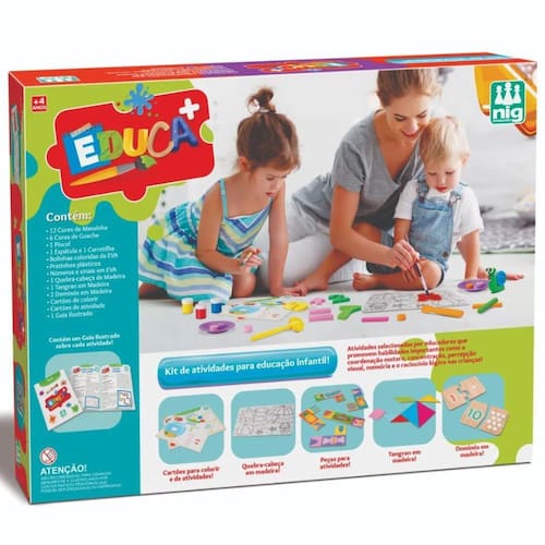 Feito com o auxilio de profissionais da educação, o Kit de Atividades Educa+ da Nig desenvolve a coordenação motora fina, a concentração, o raciocínio lógico e a criatividade das crianças. Com 10 atividades diferentes como quebra-cabeças, operações matemáticas, dominó e muito mais, esse kit vai divertir e ensinar os pequenos.Informações do Produto:Idade recomendada: 4 anos +Marca: Nig BrinquedosConteúdo da embalagem:- 1 Caixa de massinha- 6 Tintas guache- 1 Pincel- 1 Carretilha- 1 Espátula- 9 Pratinhos- 20 Númros em EVA + sinais- 1 Tangran madeira- 1 Quebra-cabeça de madeira para pintar- 1 Dominó metades madeira- 1 Dominó madeira- 22 Folhas de atividades em cartão- 80 Bolinhas coloridas em EVA- 1 Guia ilustradoInformações importantes:- Os objetos que ambientam as imagens não acompanham o produto.- Fique atento: As cores das imagens podem sofrer alterações devido a luminosidade, configurações do monitor/celular e até mesmo a percepção do usuário.