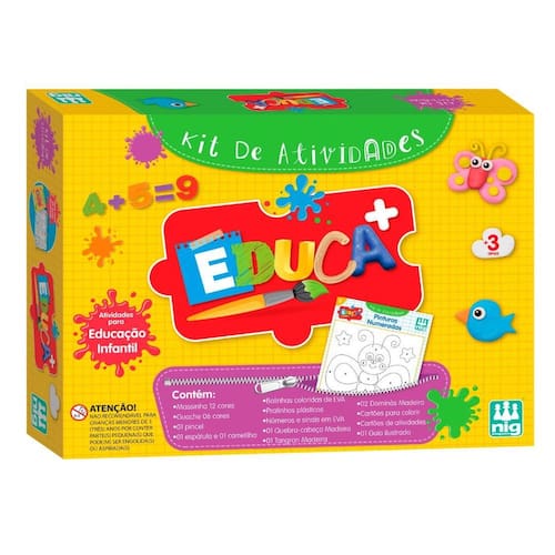 Itens inclusos: Massinha 12 cores, guache 6 cores, 1 pincel, 1 espátula, 1 carretilha, bolinhas coloridas de eva, pratinhos plásticos, números e sinais em eva, 1 quebra cabeça madeira, 1 tangram madeira, 2 dominós madeira, cartões para colorir, cartão de atividade, 1 guia ilustrado.