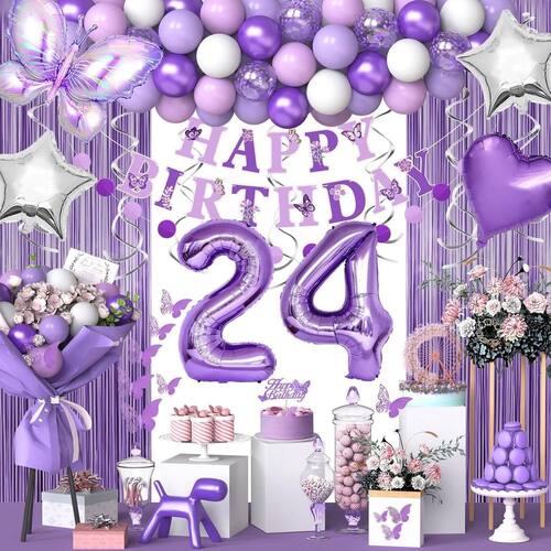 Kit de balão completo: este kit de balão com tema de borboleta roxa inclui uma mistura de balões de látex e alumínio, com um lindo design de borboleta, ideal para criar uma atmosfera elegante de aniversário. Qualidade premium: feitos com materiais de látex e alumínio de alta qualidade, esses balões são duráveis e duradouros, garantindo que suas decorações permaneçam vibrantes durante a celebração. Perfeito para festas de 24 anos: com grandes balões numéricos de alumínio metálico (24"), este kit foi projetado especificamente para comemorações de 24 anos, adicionando um toque estiloso e chique à sua decoração. Configuração versátil e fácil: o kit de balões inclui tudo o que é necessário para criar uma tela impressionante. Basta inflar e organizar os balões para transformar o local da sua festa sem esforço. Design glamoroso de borboletas: as lindas borboletas roxas, combinadas com os brilhantes balões metálicos e pastel, criam um cenário visualmente impressionante para fotos e momentos memoráveis durante a celebração do aniversário.