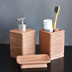 Kit De Banheiro Lavabo 3 Peças Terracota Marrom Deixe seu banheiro ainda mais organizado com esse kit, possui dispenser para sabonete liquido com capacidade para até 390ml, todo o conjunto tem textura que simulam um cordão na cor terracota que com certeza dará um charme a mais para o seu banheiro.
