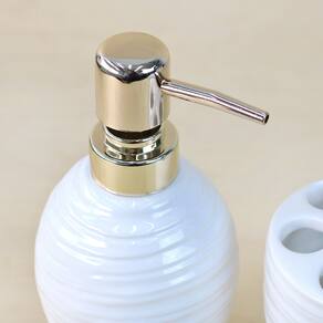 O kit de banheiro em cerâmica possui um design moderno e clean, podendo por isso ser adaptável a qualquer tipo de decoração. O bico dosador é na cor dourado.