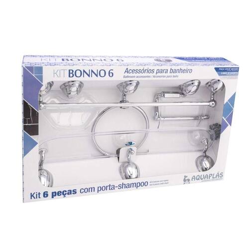 O Kit Bonno 6 peças é composto por: 1 cabide, 1 porta toalha de rosto, 1 saboneteira parede, 1 porta toalha de banho, 1 porta papel higiênico e 1 porta shampoo (acompanha buchas e parafusos).