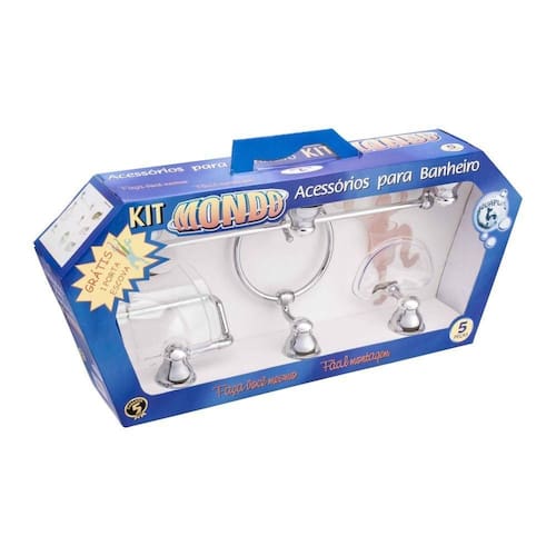 O Kit Mondo 5 peças é composto por: 1 cabide, 1 porta toalha de rosto, 1 saboneteira parede, 1 porta toalha de banho e 1 porta papel higiênico (acompanha buchas e parafusos).