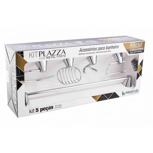 O Kit Plazza 5 peças é composto por: 1 cabide duplo, 1 porta toalha de rosto, 1 saboneteira parede, 1 porta toalha de banho e 1 porta papel higiênico (acompanha buchas e parafusos).