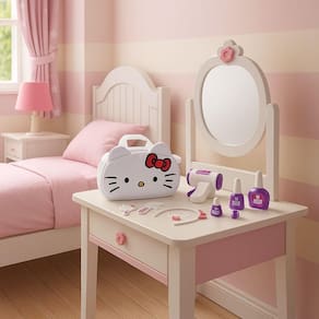 Inspirado na gatinha mais amada do mundo, ele vem com uma charmosa bolsinha personalizada e diversos itens que estimulam a imaginação e o faz de conta, como secador de cabelo de brinquedo, esmaltes de mentirinha, pente, espelho, tiara e outros acessórios encantadores.