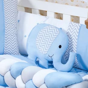 Outras peças que compõem esse kit são: 1 bandô de mosqueteiro, 1 mosqueteiro, 1 cabeceira, 1 lateral, 1 trança, 1 lençol, 1 trocador, 1 almofada elefante, 1 lençol, 1 protetor impermeável de berço. Todas essas peças são confeccionadas com tecido estampado 100% algodão, tecido colorido 100% poliéster, tecido lençol 50% algodão 50% poliéster, tule 100% poliamida, plástico 100% PVC e enchimento 100% poliéster.