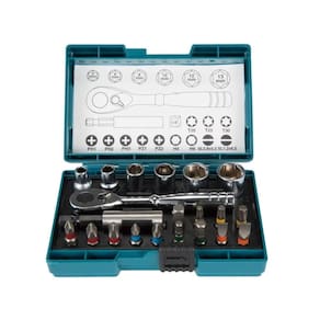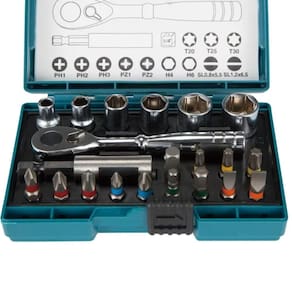 - Marca: Makita; - Referência: B-54081; - Aplicações: Madeira / Metal; - PH1, PH2, PH3 x 25mm; - T20,T25,T30 x 25mm; - SL0.8x5.5,SL1.2x6.5 x 25mm; - PZ1, PZ2 x 25mm; - H4, H6 x 25mm; - Soquete,5,6,8,10,12,13mm; - Porta-bit magnético; - Chave de catraca 1/4''; - Estojo com 21 peças; - Garantia: 3 meses.