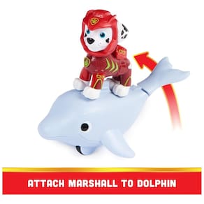 O conjunto inclui uma figura exclusiva do Marshall vestindo sua roupa de mergulho vermelha Aqua Pups, com detalhes realistas em escamas de peixe e um capacete de mergulhador super legal, e um golfinho amigo PAWsome. Use sua imaginação para criar suas próprias aventuras emocionantes de resgate de Patrulha Canina Aqua Pups com figuras de brinquedo Chase, Marshall, Rubble, Skye, Rocky e Coral, cada uma vendida separadamente.