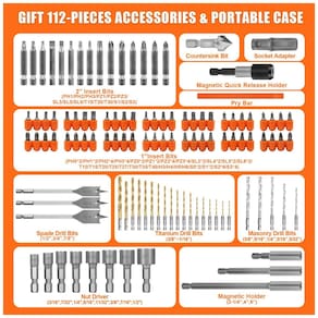 CONVENIÊNCIA TUDO EM UM Conjunto abrangente de brocas de impacto de 112 peças inclui uma ampla variedade de brocas e brocas, bem como tipos de soquetes e suportes de brocas para ajudar a auxiliar em várias aplicações de perfuração e fixação, como madeira, metal , alvenaria e muito mais.