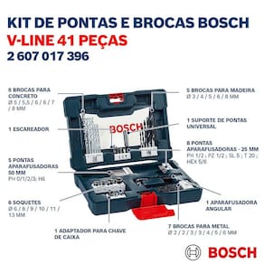 Descrição:Acessórios com a qualidade Bosch para ferramentas elétricas! O jogo V-Line - com 41 peças* de brocas e bits, com chave de catraca de 2 pontas - faz a diferença na execução das tarefas. Acondicionadas em uma prática maleta, apresentam alta resistência, qualidade e funcionalidade, ideais para reparos do dia a dia, residenciais ou profissionais.Com visor em acrílico, a resistente maleta da Bosch conta com compartimentos adequados para a organização de cada acessório. Tem 23 cm de largura, 5 cm de profundidade e 16 cm de altura, com 900 g de peso. Conta com fechamento por clipe de fácil acesso e alça para transporte.- Garantia(pelo fornecedor): 6 meses de garantia- Peso com embalagem: 922 gramas Acompanha:- 1 chave manual angular - 7 brocas para metal de: 2/2/3/3/4/5/6 mm - 6 brocas para concreto de: 5/5,5/6/6/7/8 mm - 5 brocas para madeira de: 3/4/5/6/8 mm - 8 pontas aparafusadoras, 25 mm: PH2, PH2, PZ1, PZ2, T20, H5, H6, S5- 5 pontas aparafusadoras, 50 mm de comprimento, PH2, PZ2, T20, T25, S6- 1 suporte de pontas universal - 6 chaves de caixa de Ø 6/8/9/10/11/13 mm - 1 Adaptador para chave de caixa - 1 escareador * Imagem meramente ilustrativa.