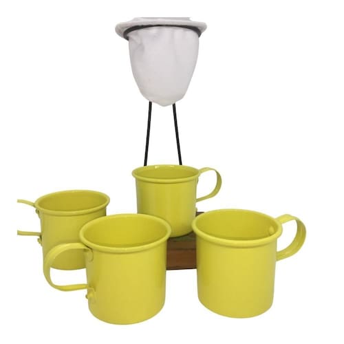 Kit de Café Individual- 4 canecas Amarela - coador Demolição Você que gosta de café coado e quer beber quando tiver vontade. Esse kit é composto pela base madeira de demolição, coador de pano, 4 quatro canequinhas Amarelas. Produto artesanal, podem ter varições nos tons. Canequinha Altura - 5,8cm Diâmetro - 6cm Coador: Base madeira de demolição: 10cm x 10cm x 2cm Altura total: 22cm Diâmetro base coador 8,5cm Ean: 7908866375665