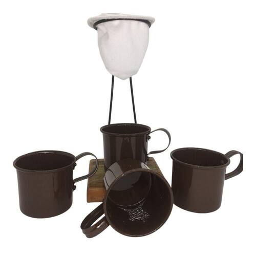 Kit de Café Individual - 4 canecas Marrom - coador Demolição Você que gosta de café coado e quer beber quando tiver vontade. Esse kit é composto pela base madeira de demolição, coador de pano, 4 quatro canequinhas Marrom. Produto artesanal, podem ter varições nos tons. Canequinha Altura - 5,8cm Diâmetro - 6cm Coador: Base madeira de demolição: 10cm x 10cm x 2cm Altura total: 22cm Diâmetro base coador 8,5cm Ean: 7908865934979