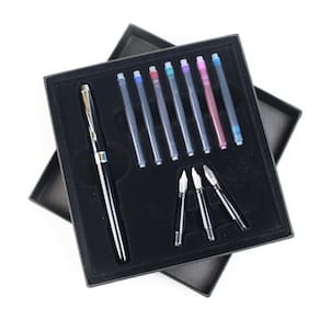 Kit De Caligrafia Kentaur Exclusive Com 3 PenasO Kit de Caligrafia da Kentaur é um presente ideal para aqueles que desejam exercitar suas atividades de escrita com refinamento e criatividade. Embalado em um exclusivo estojo de presente, o kit é composto por: 01 Caneta-base para pena caligráfica 03 Penas de caneta caligráfica nos traços itálicos 1.1, 1.5 e 1.9mm 07 cartuchos de tinta para caneta tinteiro, nas cores: preto, rosa, vermelho, verde, azul real, violeta e azul turquesaESPECIFICAÇÕES TÉCNICASMarca: KentaurModelo: Kit de Caligrafia ExclusiveComposição: ResinaRefil: Cartucho de tinta padrão internacional ou Conversor + Tinta para caneta tinteiroGarantia: 6 meses