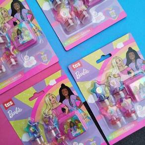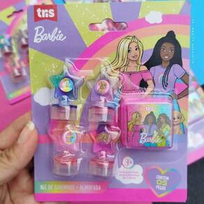 Ideal para crianças, o kit inclui quatro carimbos com estampas variadas, inspiradas no encantador universo da Barbie.