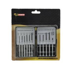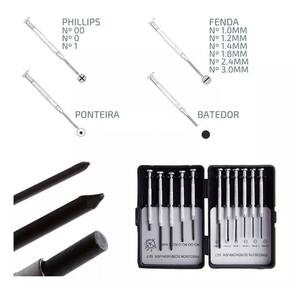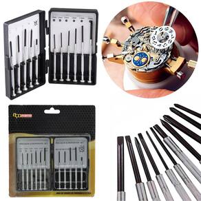 O Kit Jogo Chaves de Precisão Relojoeiro/Eletrônica 11 peças conta com estojo plástico e possui tamanhos diferentes para auxiliar você em diversos tipos de serviços ou trabalhos, tanto hobby como em: - Industrias; - Informática; - Eletrônicas; - Residências; - Relojoarias; - Oficinas em Geral; Sendo ideal para: - Relojoarias, Eletrônica, reparos e manutenções em celulares, câmeras digitais, computadores, serviços de precisão, entre outras utilidades. Medidas do Kit Jogo Chaves de Precisão Relojoeiro/Eletrônica 11 peças com Estojo - 01 Chave pontuda; - 01 Chave com ponta achatada; - 03 Chaves Phillips: PH 00 - PH 0 - PH 1; - 06 Chaves de fenda: 1mm - 1.2mm - 1.4mm - 1.8mm - 2.4mm - 3 mm. Vantagens do Kit Jogo Chaves de Precisão Relojoeiro 11 peças com Estojo - Ótima Qualidade; - Apoio Superior Giratório; - Ponta em Aço Temperado de Alta Resistência; - Fabricado em aço especial de alta qualidade e resistência; - Acompanha Estojo plástico para armazenamento das Chaves; - Haste de aço cromado com ranhuras para maior aderência e transmissão de força. Especificações do Kit Jogo Chaves de Precisão Relojoeiro 11 peças com Estojo - Fertak - Marca: Aço Forte - Material: Aço Temperado - Modelo: Jogo Chaves de Precisão Relojoeiro 11 peças - Quantidade: 11 peças Diferentes Tamanhos DÚVIDAS FREQUENTES: 1 - Os produtos são novos R: Todos os produtos são novos e com . 3 - O produto acompanha R: Toda a mercadoria é acompanhada de emitida para o CPF/CNPJ informado na compra. 4 - Como são realizadas as entregas R: Sim, nos anúncios que exibirem essa opção. Imagens meramente ilustrativas Ean: 7897373164025
