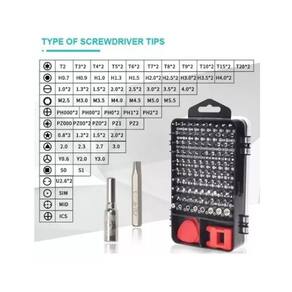 Kit de chaves precisão 115 em 1 celular notebook tablet - quantidade de peças: 115; - equipado com todas as ferramentas necessárias, adequadas para todos os tipos de trabalho em equipamentos de micro porte; - contém cabo flexível, ideal para locais onde o comprimento do cabo atrapalha o encaixe; - alto desempenho com cabeças de chave de fenda duráveis, feitas em aço crv o que garante o uso a longo prazo. - fácil de transportar, pode ser colocado em bolsas de viagem, carros ou caixas de ferramentas. - chaves de fenda magnéticas;