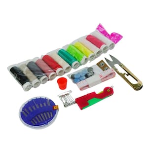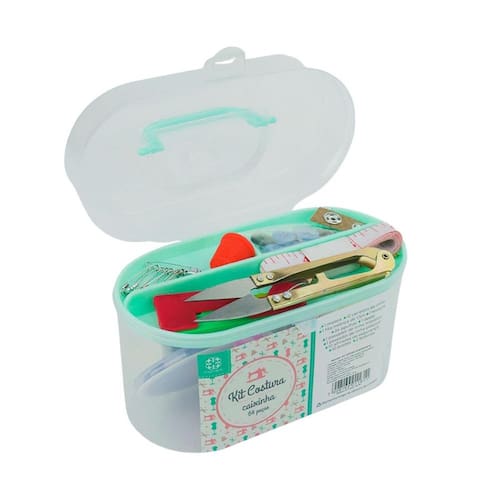 KIT de Costura 64 Peças com Maleta Contém: 12 Carretéis de linha, 1 Passador de linha, 1 Fita métrica 1,5m, 10 Alfinetes de segurança, 1 Tesoura, 10 Botões, 24 Agulhas, 1 dedal, 1 maleta, 1 passador de linha metálico;\nEspecificações:\nMarca : C3B\nTipo de material : Plástico\nCores ou Estampa : Colorido\nDimensões do Produto : 9 X 14,5 X 7 CM\nDimensões da Embalagem : 9 X 14,5 X 7 CM\nPeso Bruto (Gramas) : 0.126 Marca: Não Informado