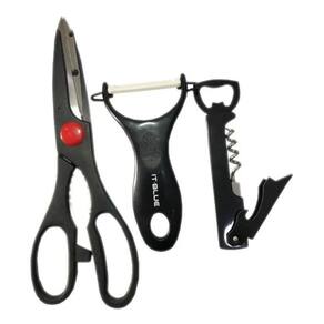O Kit De Cozinha Saca Rolha Tesoura Descascador Abridor. Com um comprimento ideal, garantindo durabilidade e resistência. Suas tesouras de cozinha possuem corte reto e ponta especial, facilitando o uso em diversas tarefas culinárias. Adquira já o seu e tenha mais praticidade na sua cozinha.